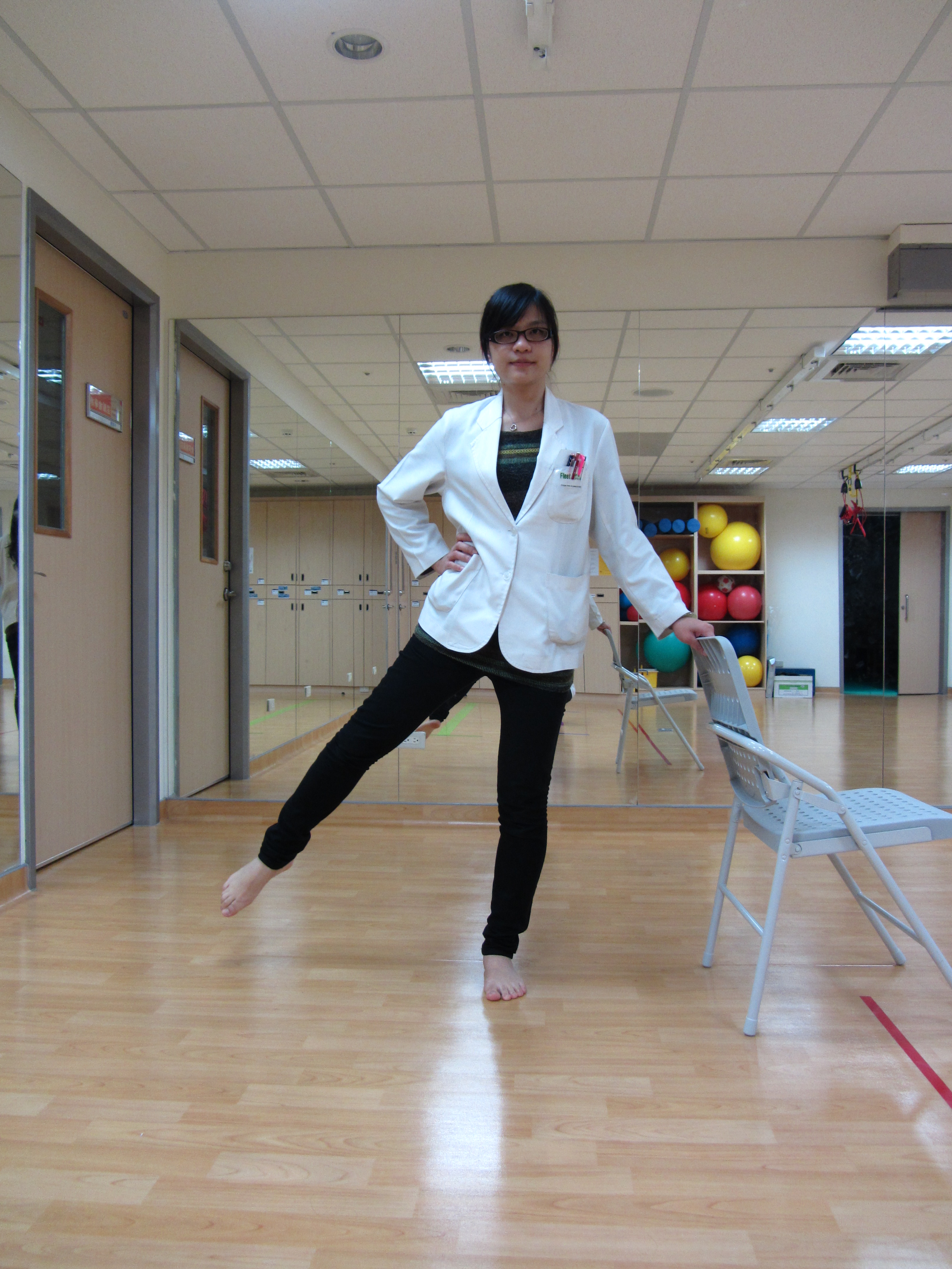 縮下腹,一手扶椅背,對側腳往側邊抬起,維持10秒後再慢慢返回原姿勢,重覆10次,再換邊
