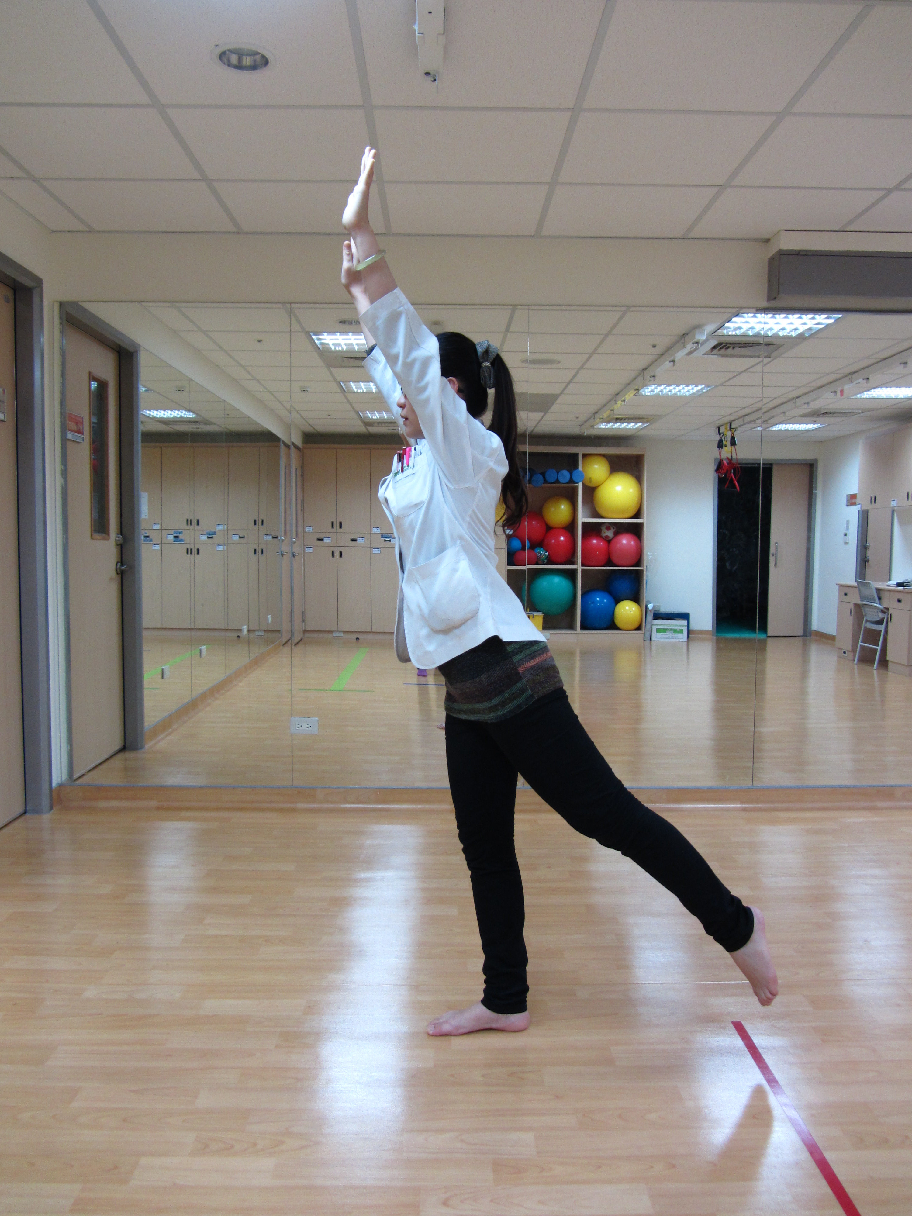 起始姿勢:雙腳站穩,兩手於耳側往上伸展