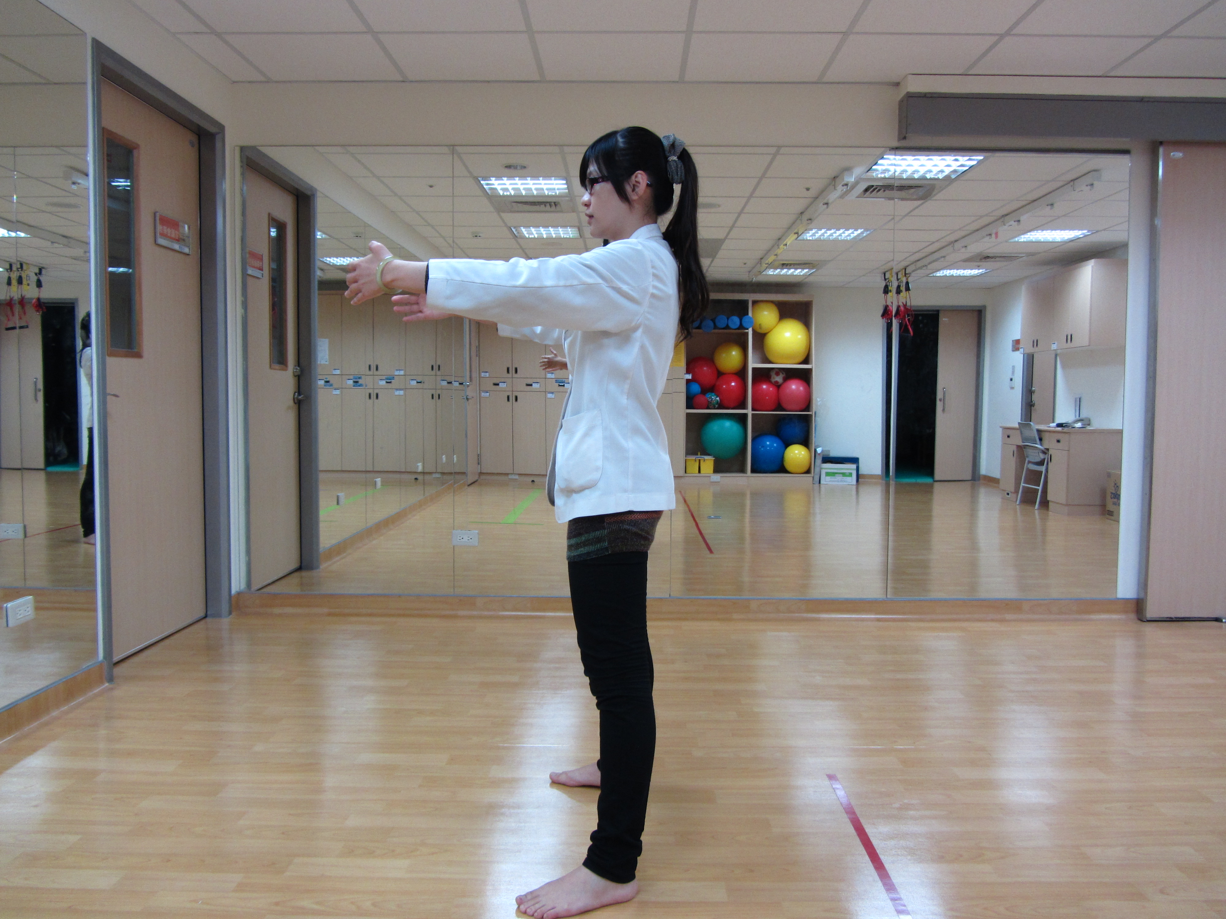 起始姿勢:雙腳打開與肩同寬,雙手平舉環抱於胸前,肩膀放鬆