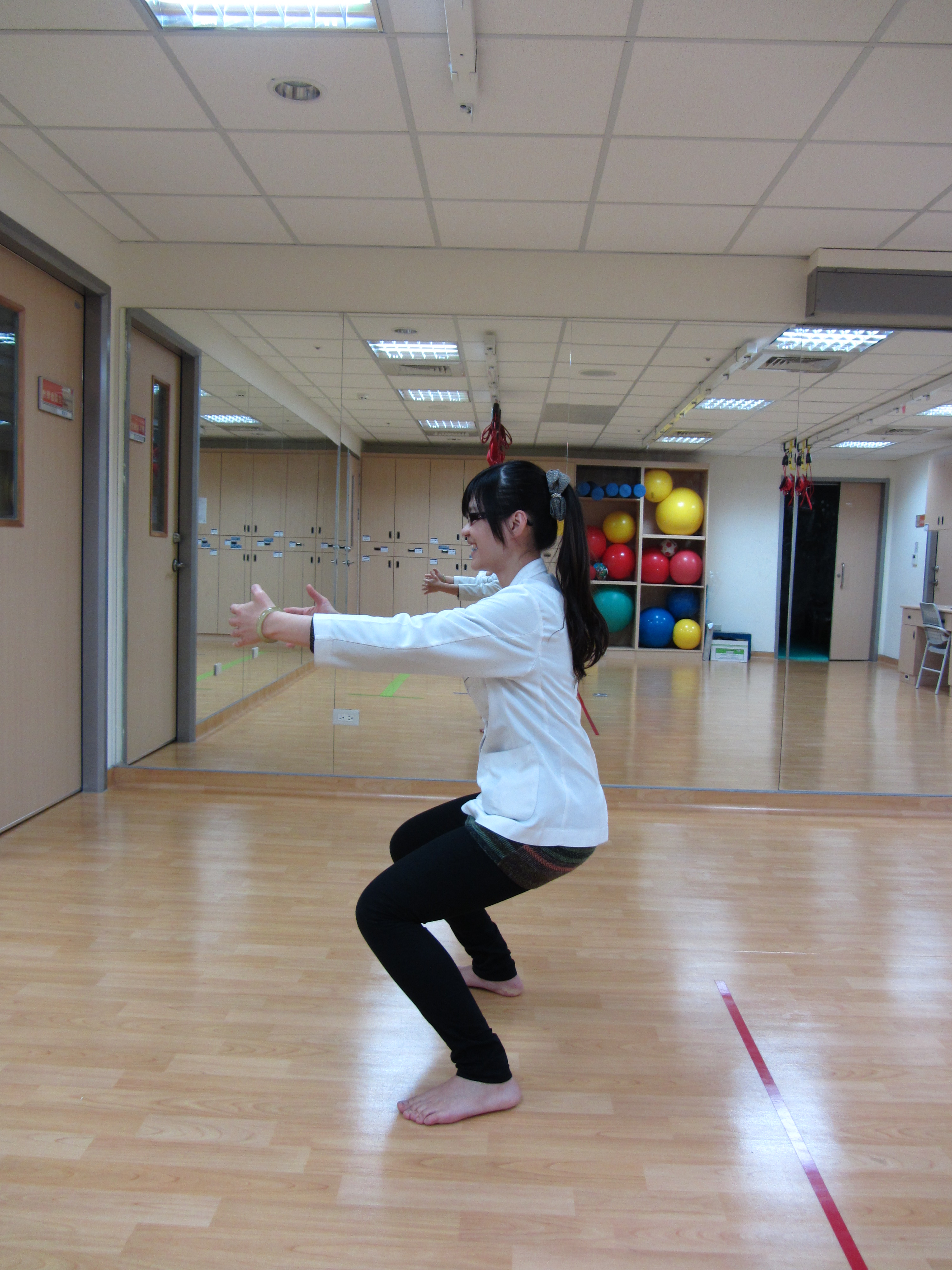 縮下腹,屁股往下坐成半蹲狀,一次10秒再慢慢回復原姿勢,重複10次