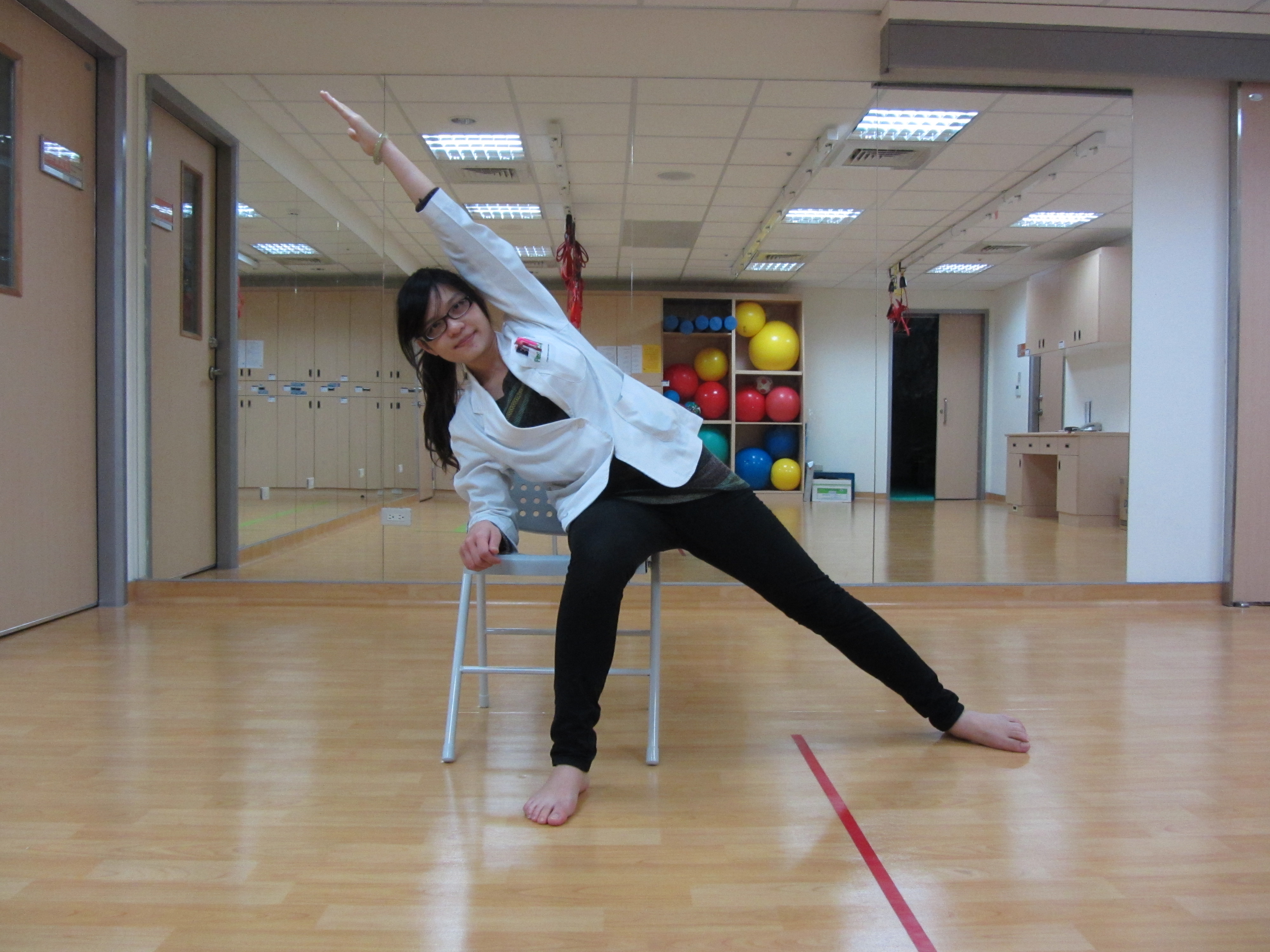 身體側向一側,同側手肘撐在椅面上,對側腳往另一邊延伸,對側手往上方延伸,使手與腳成一直線,維持10秒,重覆10次,再換另一側